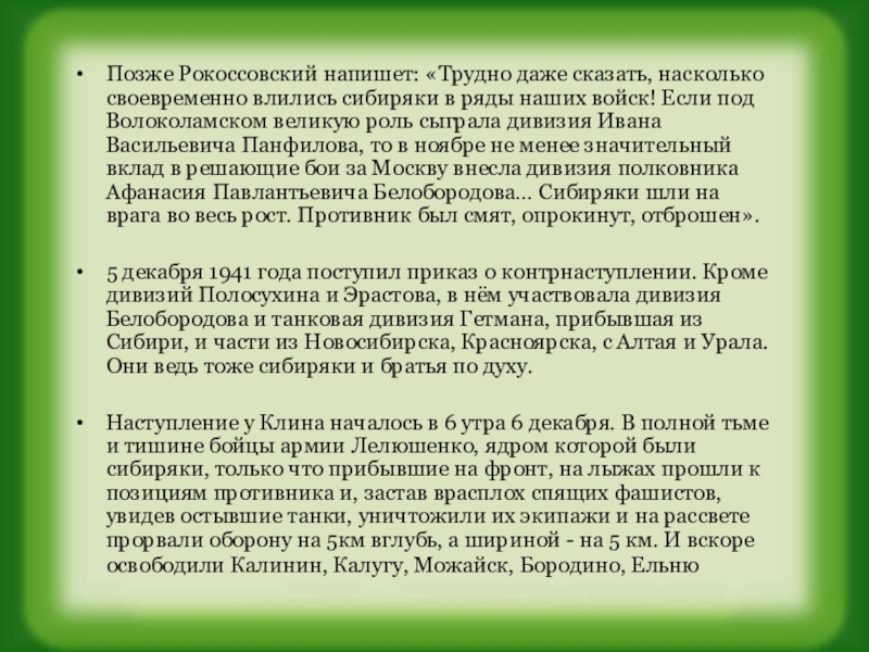 Слайд 9Позже Рокоссовский напишет: «Трудно даже сказать, насколько своевременно влились сибиряки в
