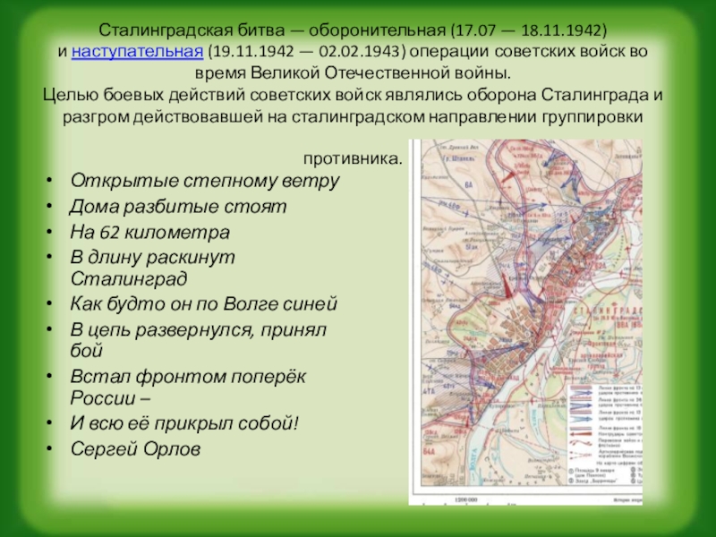 Слайд 12Сталинградская битва — оборонительная (17.07 — 18.11.1942) и наступательная (19.11.1942 — 02.02.1943) операции советских войск во