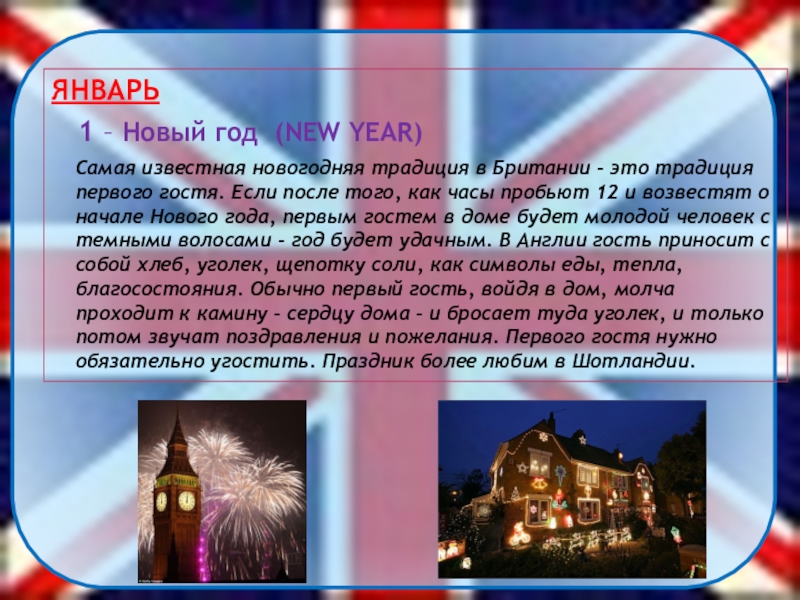 известная новогодняя традиция в Британии - это традиция первого гостя. Если после того, как часы пробьют 12 и возвестят о начале Нового года, первым гостем в доме будет молодой человек с темными волосами - год будет удачным. В Англии гость приносит с собой хлеб, уголек, щепотку соли, как символы еды, тепла, благосостояния. Обычно первый гость, войдя в дом, молча проходит к камину - сердцу дома - и бросает туда уголек, и только потом звучат поздравления и пожелания. Первого гостя нужно обязательно угостить. Праздник более любим в Шотландии.