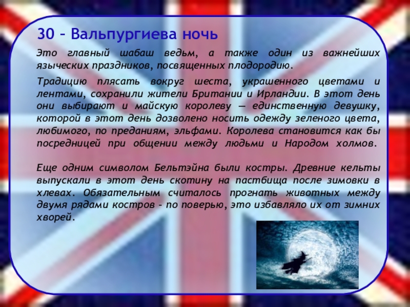 Традицию плясать вокруг шеста, украшенного цветами и лентами, сохранили жители Британии и Ирландии. В этот день они выбирают и майскую королеву — единственную девушку, которой в этот день дозволено носить одежду зеленого цвета, любимого, по преданиям, эльфами. Королева становится как бы посредницей при общении между людьми и Народом холмов.