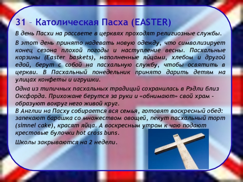 В Англии на Пасху собирается вся семья, готовят воскресный обед: запекают барашка со множеством овощей, пекут пасхальный торт (simnel cake), красят яйца. А воскресным утром к чаю подают крестовые булочки hot cross buns.