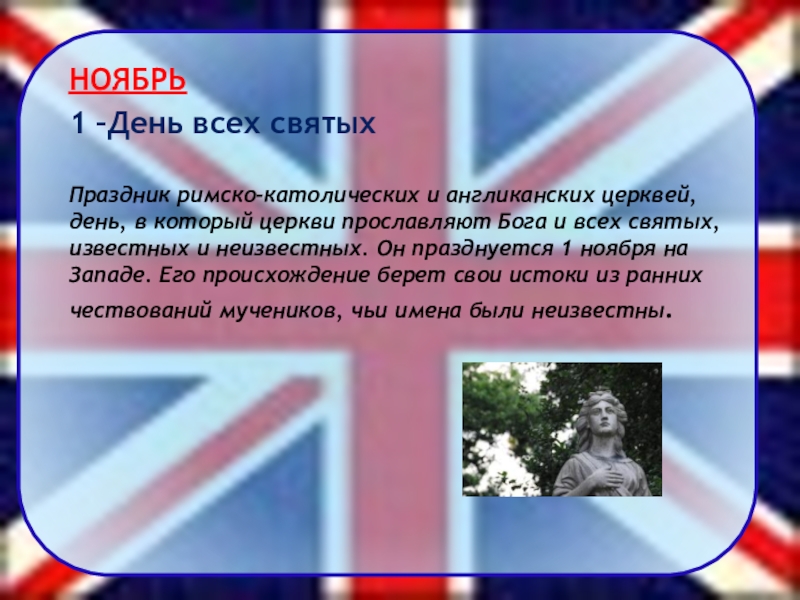который церкви прославляют Бога и всех святых, известных и неизвестных. Он празднуется 1 ноября на Западе. Его происхождение берет свои истоки из ранних чествований мучеников, чьи имена были неизвестны.