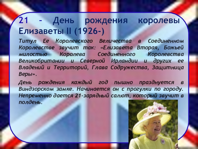 День рождения каждый год пышно празднуется в Виндзорском замке. Начинается он с прогулки по городу. Непременно дается 21-зарядный салют, который звучит в полдень.