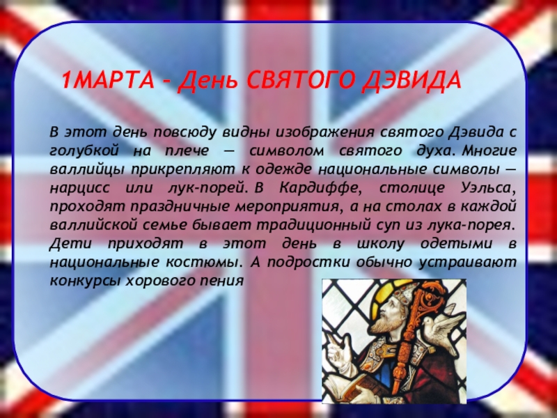 святого Дэвида с голубкой на плече — символом святого духа. Многие валлийцы прикрепляют к одежде национальные символы — нарцисс или лук-порей. В Кардиффе, столице Уэльса, проходят праздничные мероприятия, а на столах в каждой валлийской семье бывает традиционный суп из лука-порея. Дети приходят в этот день в школу одетыми в национальные костюмы. А подростки обычно устраивают конкурсы хорового пения