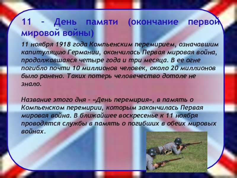 Название этого дня – «День перемирия», в память о Компьенском перемирии, которым закончилась Первая мировая война. В ближайшее воскресенье к 11 ноября проводятся службы в память о погибших в обеих мировых войнах.