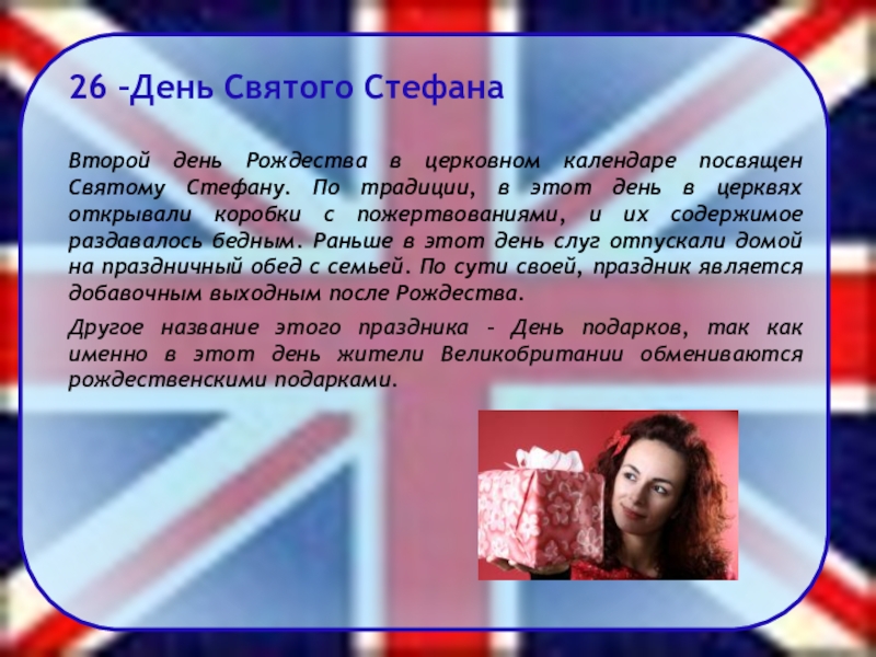 Другое название этого праздника – День подарков, так как именно в этот день жители Великобритании обмениваются рождественскими подарками.