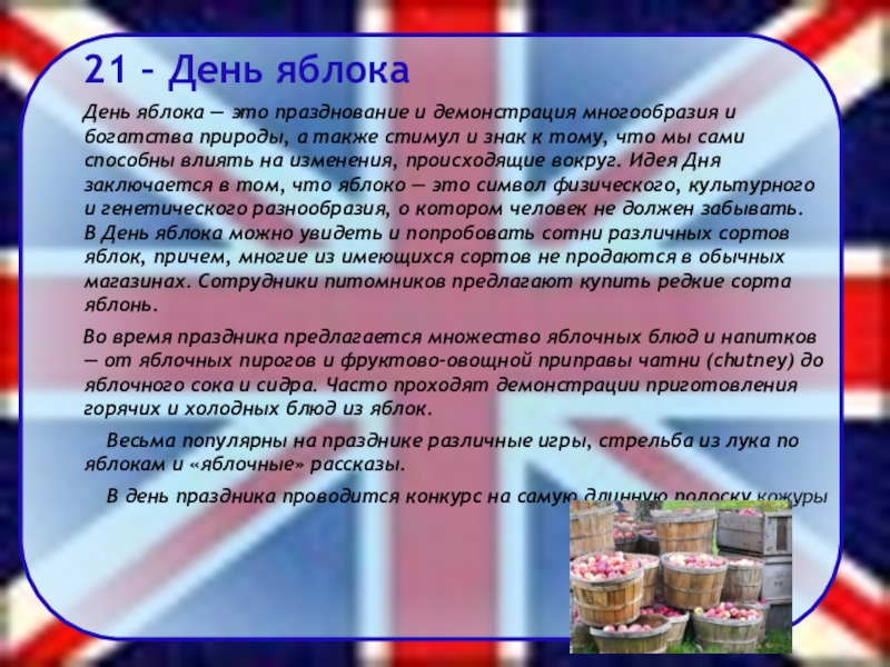 и богатства природы, а также стимул и знак к тому, что мы сами способны влиять на изменения, происходящие вокруг. Идея Дня заключается в том, что яблоко — это символ физического, культурного и генетического разнообразия, о котором человек не должен забывать.