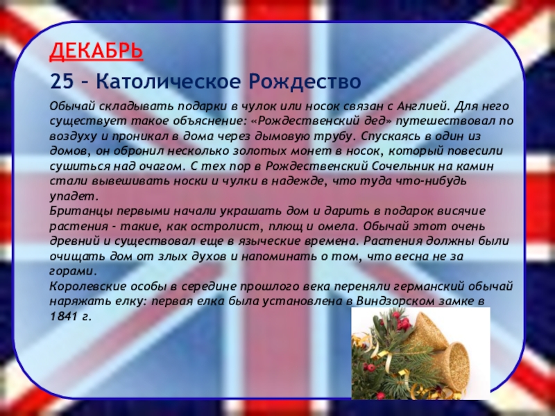 с Англией. Для него существует такое объяснение: «Рождественский дед» путешествовал по воздуху и проникал в дома через дымовую трубу. Спускаясь в один из домов, он обронил несколько золотых монет в носок, который повесили сушиться над очагом. С тех пор в Рождественский Сочельник на камин стали вывешивать носки и чулки в надежде, что туда что-нибудь упадет.