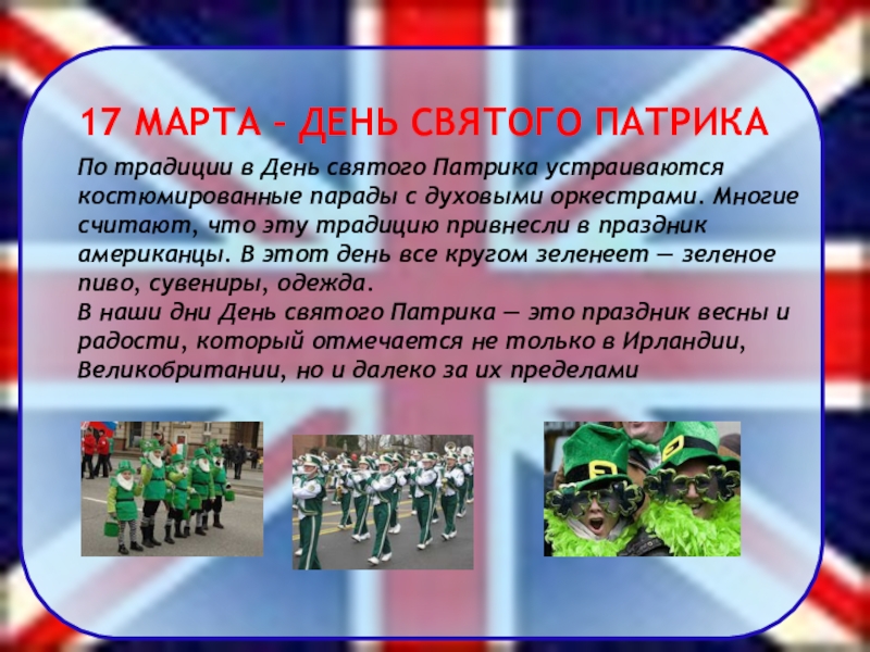 устраиваются костюмированные парады с духовыми оркестрами. Многие считают, что эту традицию привнесли в праздник американцы. В этот день все кругом зеленеет — зеленое пиво, сувениры, одежда.