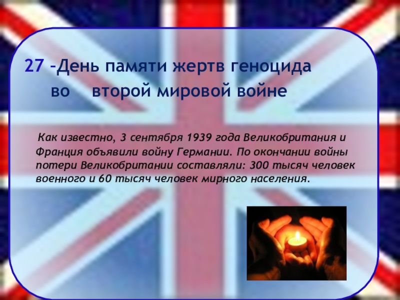 Как известно, 3 сентября 1939 года Великобритания и Франция объявили войну Германии. По окончании войны потери Великобритании составляли: 300 тысяч человек военного и 60 тысяч человек мирного населения.