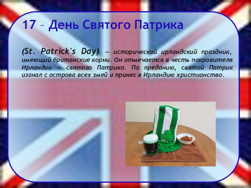 имеющий британские корни. Он отмечается в честь покровителя Ирландии — святого Патрика. По преданию, святой Патрик изгнал с острова всех змей и принес в Ирландию христианство.
