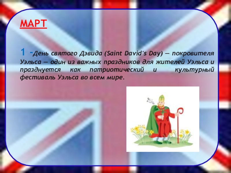 1 -День святого Дэвида (Saint David's Day) — покровителя Уэльса —