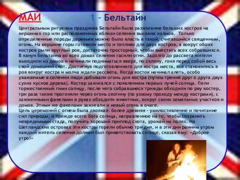 Еще одним символом Бельтэйна были костры. Древние кельты выпускали в этот день скотину на пастбища после зимовки в хлевах. Обязательным считалось прогнать животных между двумя рядами костров – по поверью, это избавляло их от зимних хворей.