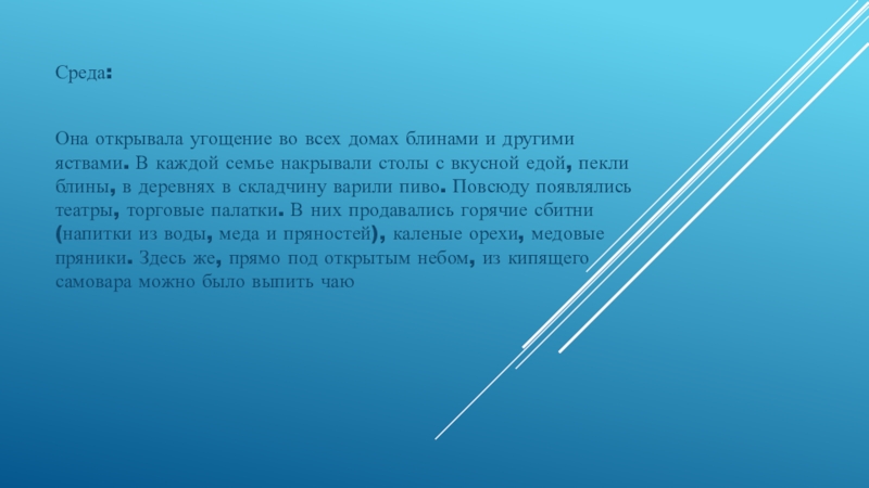 каждой семье накрывали столы с вкусной едой, пекли блины, в деревнях в складчину варили пиво. Повсюду появлялись театры, торговые палатки. В них продавались горячие сбитни (напитки из воды, меда и пряностей), каленые орехи, медовые пряники. Здесь же, прямо под открытым небом, из кипящего самовара можно было выпить чаю