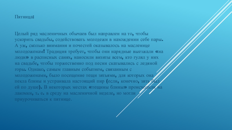 содействовать молодежи в нахождении себе пары. А уж, сколько внимания и почестей оказывалось на масленице молодоженам! Традиция требует, чтобы они нарядные выезжали «на люди» в расписных санях, наносили визиты всем, кто гулял у них на свадьбе, чтобы торжественно под песни скатывались с ледяной горы. Однако, самым главным событием, связанным с молодоженами, было посещение тещи зятьями, для которых она пекла блины и устраивала настоящий пир (если, конечно, зять был ей по душе). В некоторых местах «тещины блины» происходили на лакомки, т. е. в среду на масленичной неделе, но могли приурочиваться к пятнице.