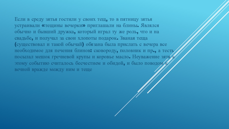 зятья устраивали «тещины вечерки» приглашали на блины. Являлся обычно и бывший дружка, который играл ту же роль, что и на свадьбе, и получал за свои хлопоты подарок. Званая теща (существовал и такой обычай) обязана была прислать с вечера все необходимое для печения блинов: сковороду, половник и пр., а тесть посылал мешок гречневой крупы и коровье масло. Неуважение зятя к этому событию считалось бесчестием и обидой, и было поводом к вечной вражде между ним и теще