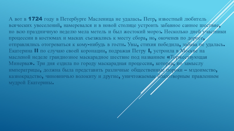 Слайд 8А вот в 1724 году в Петербурге Масленица не удалась. Петр,