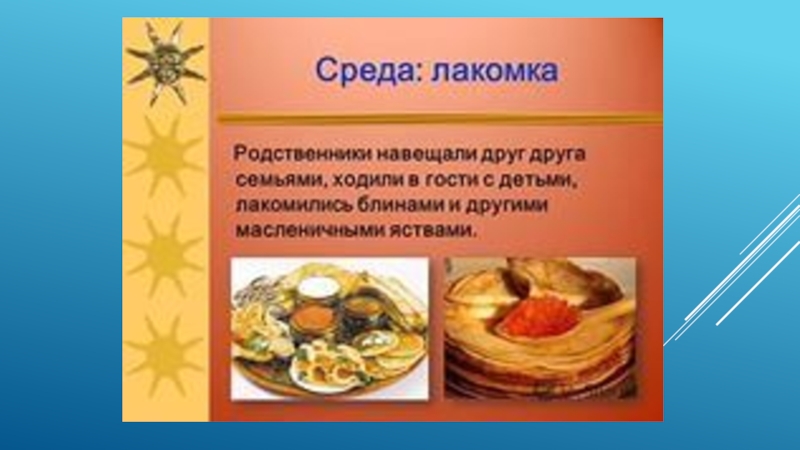 Она открывала угощение во всех домах блинами и другими яствами. В