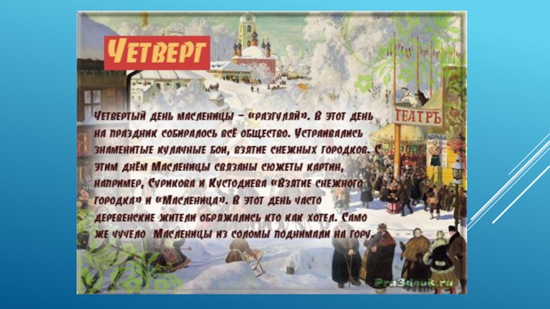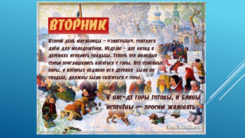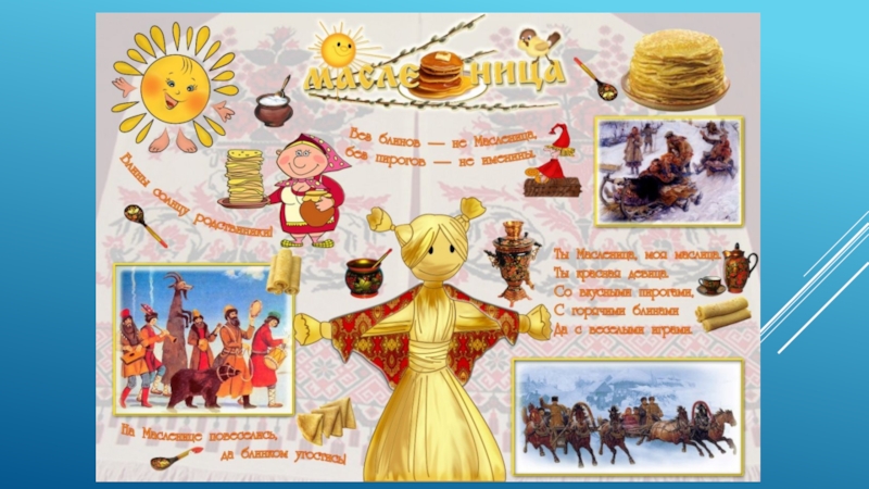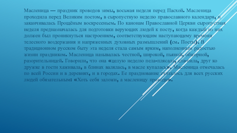Слайд 2Масленица — праздник проводов зимы, восьмая неделя перед Пасхой. Масленица проходила