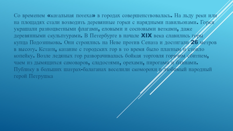 на площадях стали возводить деревянные горки с нарядными павильонами. Горки украшали разноцветными флагами, еловыми и сосновыми ветками, даже деревянными скульптурами. В Петербурге в начале XIX века славились горы купца Подозникова. Они строились на Неве против Сената и достигали 26 метров в высоту. Кстати, катание с городских гор в то время было платным и стоило копейку. Возле ледяных гор разворачивалась бойкая торговля горячим сбитнем, чаем из дымящихся самоваров, сладостями, орехами, пирогами и блинами. Публику в больших шатрах-балаганах веселили скоморохи и любимый народный герой Петрушка
