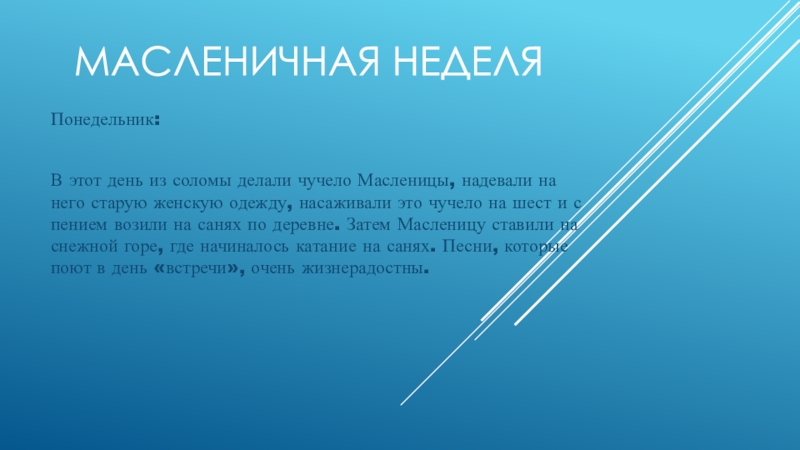 него старую женскую одежду, насаживали это чучело на шест и с пением возили на санях по деревне. Затем Масленицу ставили на снежной горе, где начиналось катание на санях. Песни, которые поют в день «встречи», очень жизнерадостны.