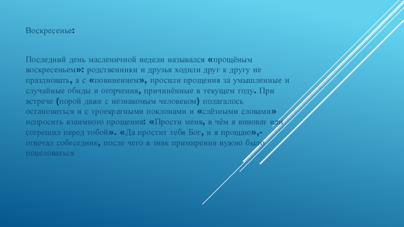 друг к другу не праздновать, а с «повинением», просили прощения за умышленные и случайные обиды и огорчения, причинённые в текущем году. При встрече (порой даже с незнакомым человеком) полагалось остановиться и с троекратными поклонами и «слёзными словами» испросить взаимного прощения: «Прости меня, в чём я виноват или согрешил перед тобой». «Да простит тебя Бог, и я прощаю»,- отвечал собеседник, после чего в знак примирения нужно было поцеловаться