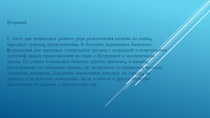 гулянья, представления. В больших деревянных балаганах (помещения для народных театральных зрелищ с клоунадой и комическими сценами) давали представления во главе с Петрушкой и масленичным дедом. На улицах попадались большие группы ряженых, в масках, разъезжавших по знакомым домам, где экспромтом устраивались веселые домашние концерты. Большими компаниями катались по городу, на тройках и на простых розвальнях. Было в почете и другое нехитрое развлечение — катание с обледенелых гор.