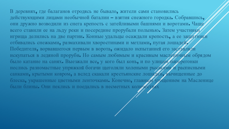лицами необычной баталии – взятия снежного городка. Собравшись, они дружно возводили из снега крепость с затейливыми башнями и воротами. Чаще всего ставили ее на льду реки и посередине прорубали полынью. Затем участники игрища делились на две партии. Конные удальцы осаждали крепость, а ее защитники отбивались снежками, размахивали хворостинами и метлами, пугая лошадей. Победителя, ворвавшегося первым в ворота, ожидало испытание: его заставляли искупаться в ледяной проруби. Но самым любимым и красивым масленичным обрядом было катание на санях. Выезжали все, у кого был конь, и по улицам наперегонки неслись разномастные упряжки: богачи щеголяли холеными рысаками и расписными санками, крытыми ковром, а вслед скакали крестьянские лошадки, вычищенные до блеска, украшенные цветными ленточками. Конечно, главным угощением на Масленице были блины. Они пеклись и поедались в несметных количествах