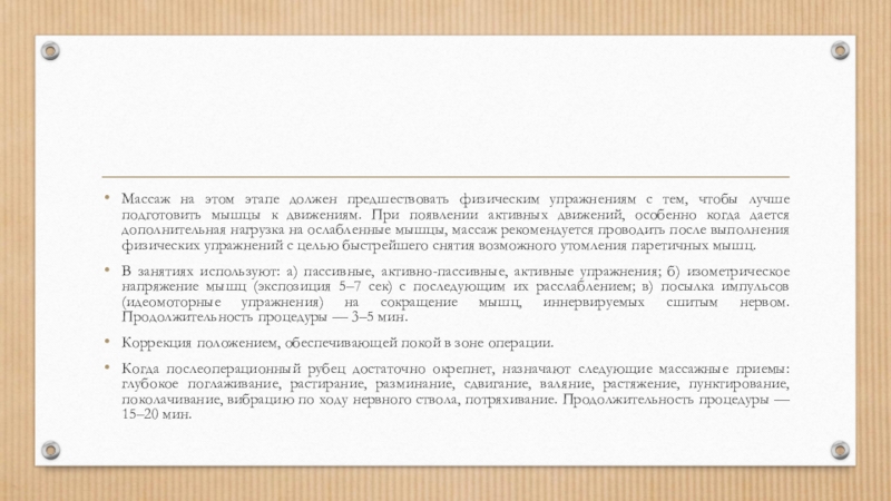 Слайд 12Массаж на этом этапе должен предшествовать физическим упражнениям с тем, чтобы