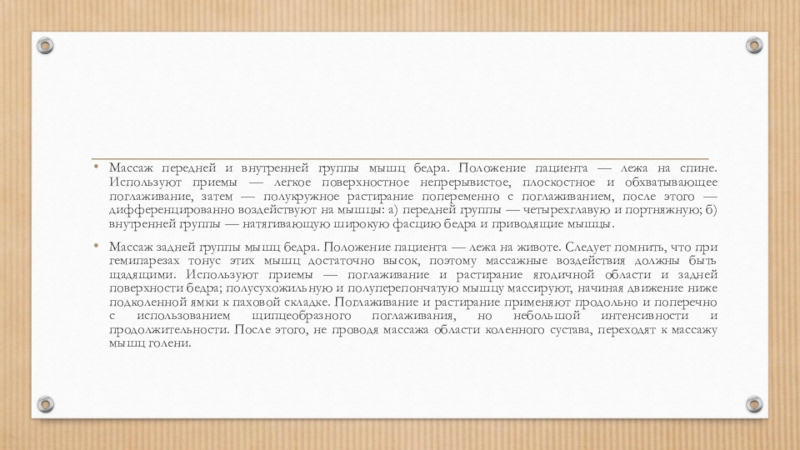 Слайд 7Массаж передней и внутренней группы мышц бедра. Положение пациента — лежа