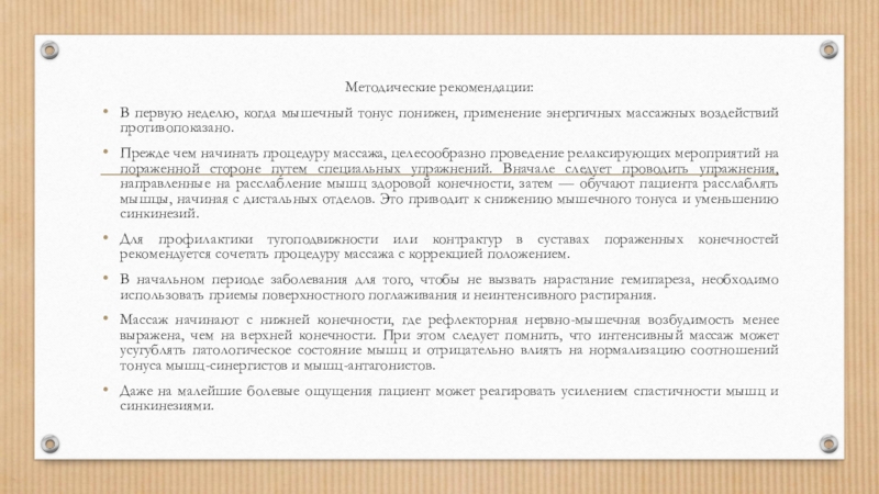 В начальном периоде заболевания для того, чтобы не вызвать нарастание гемипареза, необходимо использовать приемы поверхностного поглаживания и неинтенсивного растирания.
