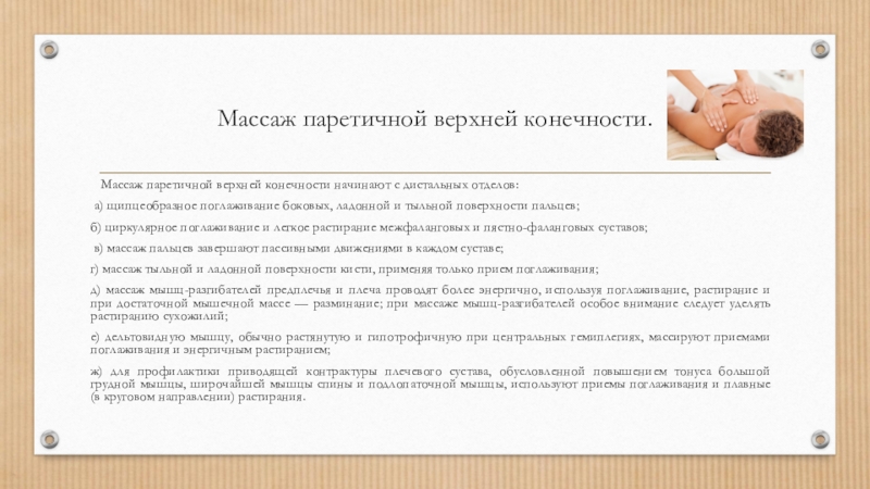 Слайд 5Массаж паретичной верхней конечности.