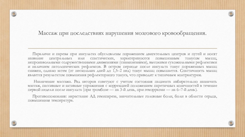 Слайд 2Массаж при последствиях нарушения мозгового кровообращения.