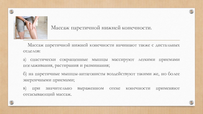 Слайд 6Массаж паретичной нижней конечности.