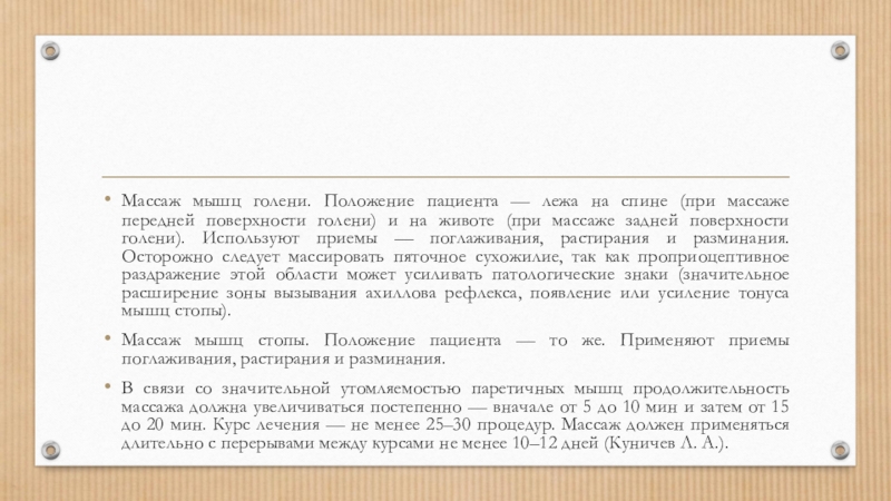 передней поверхности голени) и на животе (при массаже задней поверхности голени). Используют приемы — поглаживания, растирания и разминания. Осторожно следует массировать пяточное сухожилие, так как проприоцептивное раздражение этой области может усиливать патологические знаки (значительное расширение зоны вызывания ахиллова рефлекса, появление или усиление тонуса мышц стопы).