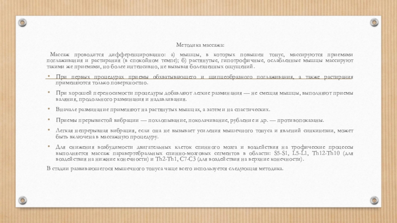 Для снижения возбудимости двигательных клеток спинного мозга и воздействия на трофические процессы выполняется массаж паравертебральных спинно-мозговых сегментов в области: S5-S1, L5-L1, Th12-Th10 (для воздействия на нижние конечности) и Th2-Th1, C7-C3 (для воздействия на верхние конечности).