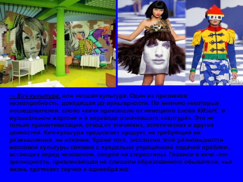 Слайд 3— Кич культура, или низшая культура. Один из признаков: низкопробность, доходящая до вульгарности.