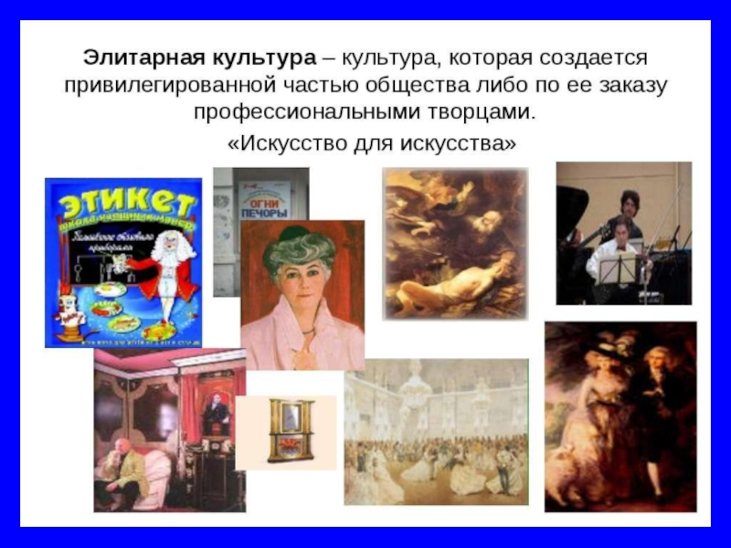 Слайд 5Арт-кулътура, приближающаяся к высокой культуре, не лишённая художественного содержания, эстетического вкуса. Этот
