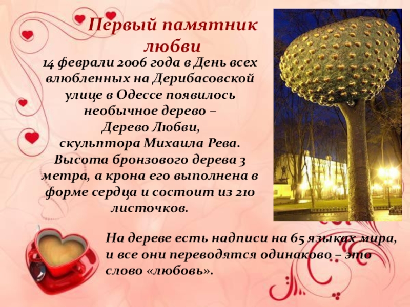 На дереве есть надписи на 65 языках мира, и все они переводятся одинаково – это слово «любовь».