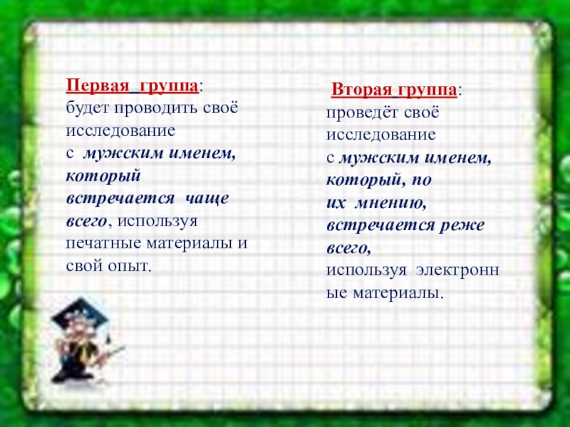 Вторая группа: проведёт своё исследование с мужским именем, который, по их мнению, встречается реже всего, используя электронные материалы.