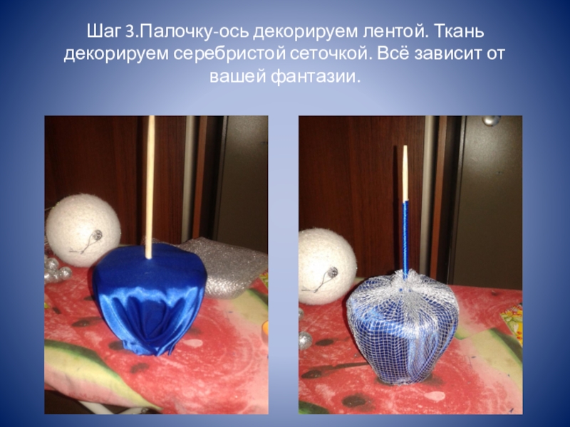 Слайд 7Шаг 3.Палочку-ось декорируем лентой. Ткань декорируем серебристой сеточкой. Всё зависит от