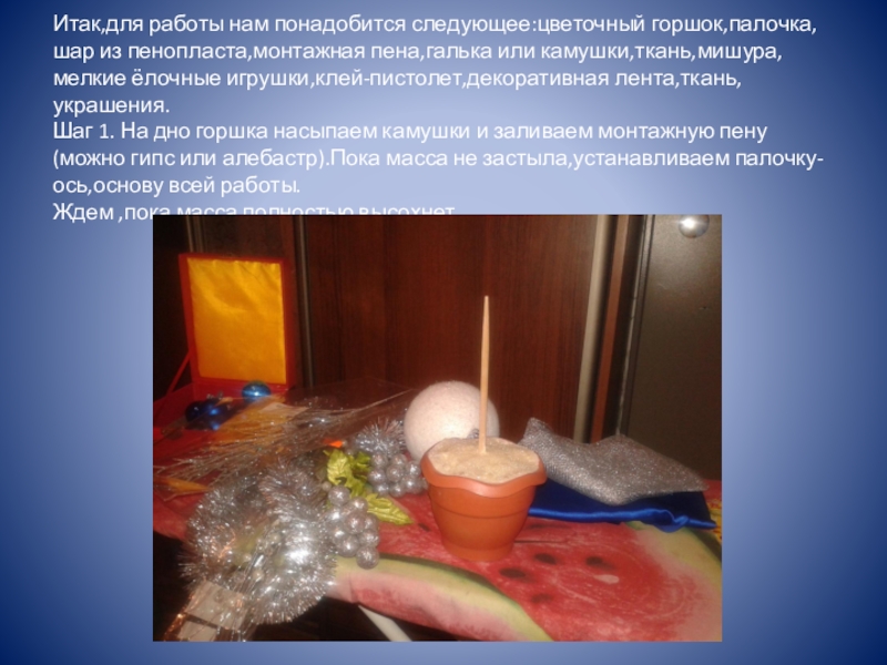 Слайд 5Итак,для работы нам понадобится следующее:цветочный горшок,палочка,шар из пенопласта,монтажная пена,галька или камушки,ткань,мишура,мелкие