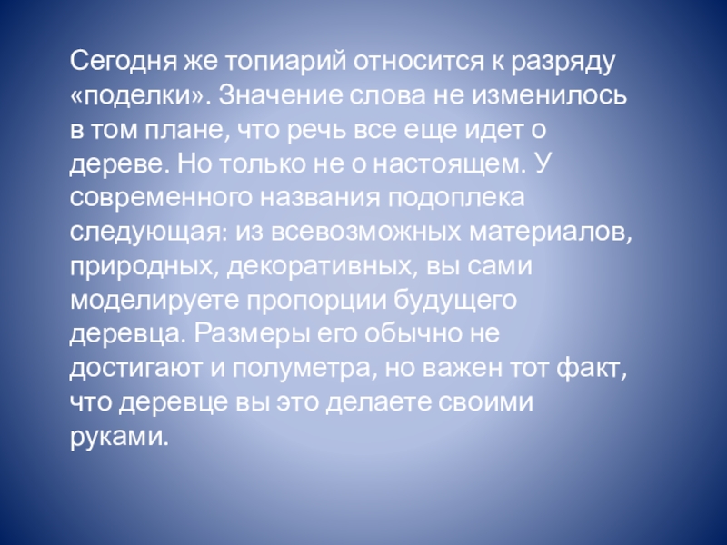 Слайд 4Сегодня же топиарий относится к разряду «поделки». Значение слова не изменилось