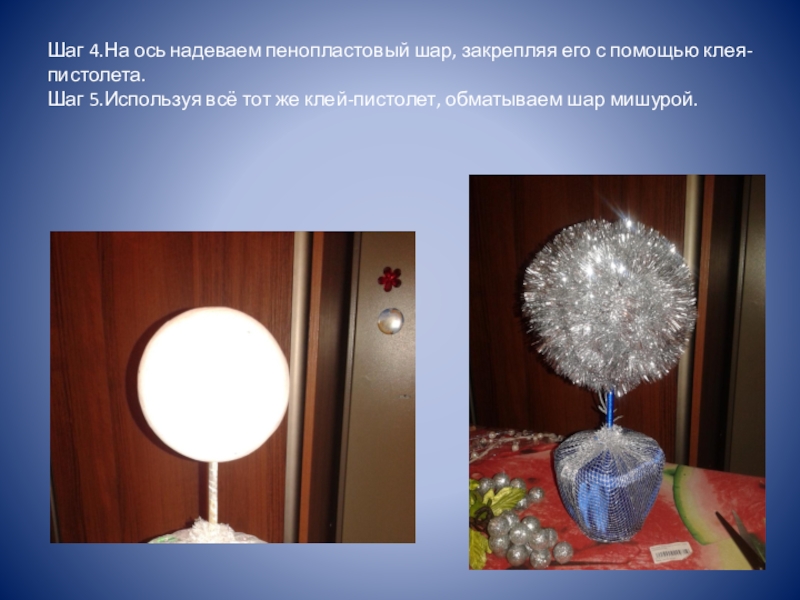 Слайд 8Шаг 4.На ось надеваем пенопластовый шар, закрепляя его с помощью клея-пистолета. Шаг