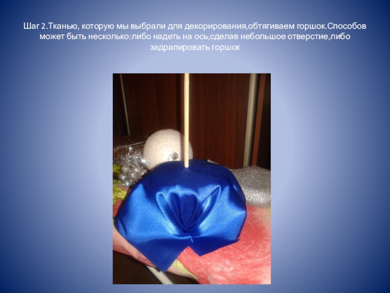 Слайд 6Шаг 2.Тканью, которую мы выбрали для декорирования,обтягиваем горшок.Способов может быть несколько:либо