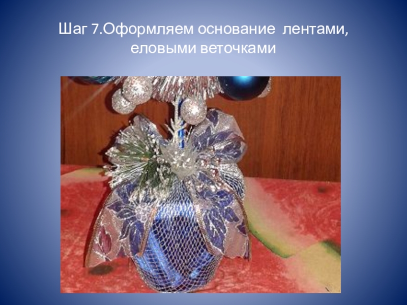 Слайд 10Шаг 7.Оформляем основание лентами, еловыми веточками