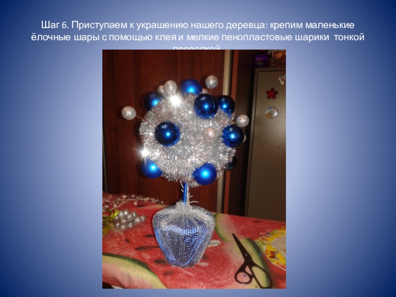 Слайд 9Шаг 6. Приступаем к украшению нашего деревца: крепим маленькие ёлочные шары