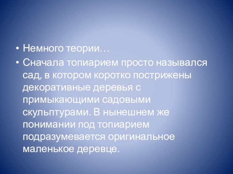 Немного теории…Сначала топиарием просто назывался сад, в котором коротко пострижены декоративные деревья с примыкающими садовыми скульптурами. В нынешнем же понимании под топиарием подразумевается оригинальное маленькое деревце.