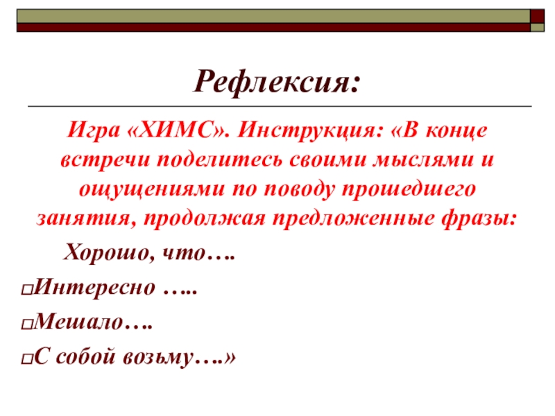 Игра «ХИМС». Инструкция: «В конце встречи поделитесь своими мыслями и ощущениями