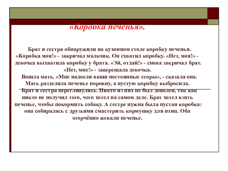 Вошла мать. «Мне надоели ваши постоянные ссоры», - сказала она. Мать разделила печенье поровну, а пустую коробку выбросила.